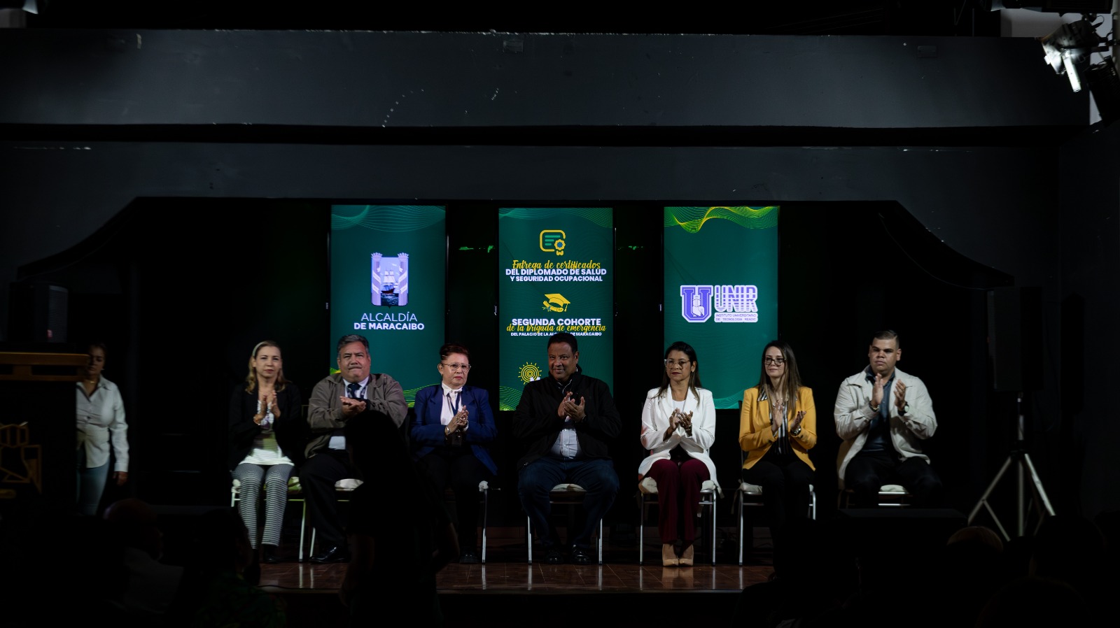 La entrega de reconocimientos realizada en el auditorio del Readic, estuvo a cargo del alcalde de Maracaibo, Rafael Ramírez Colina; el jefe de Seguridad y Salud en el Trabajo de la Alcaldía de Maracaibo Luis Delgado; y la subdirectora académica del UNIR, Yamel Chourio Villasmil; quienes valoraron la alianza entre ambas instituciones para logra la capacitación del personal de la municipalidad y la ampliación de los conocimientos de los próximos profesionales que estudian en el UNIR.