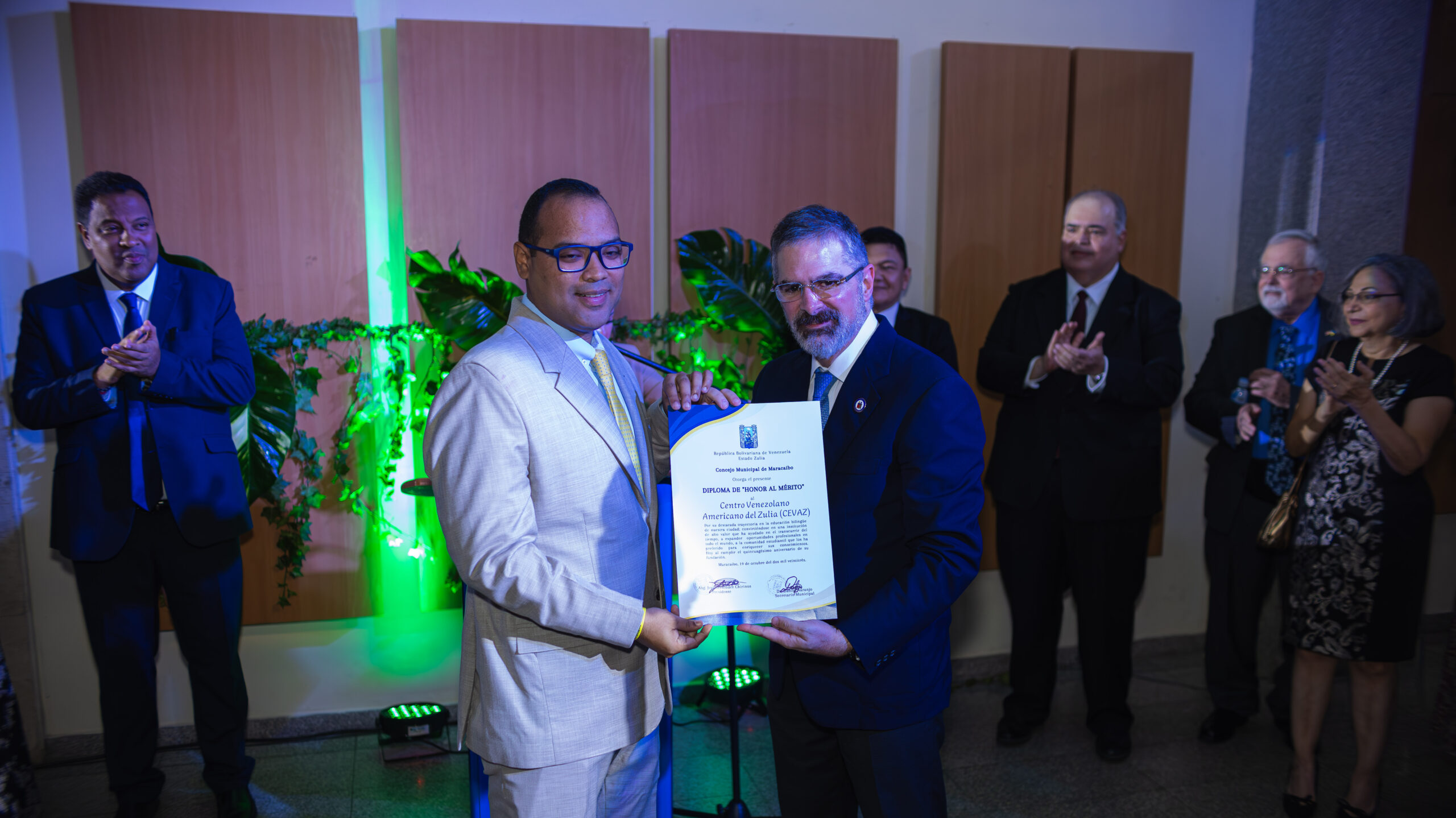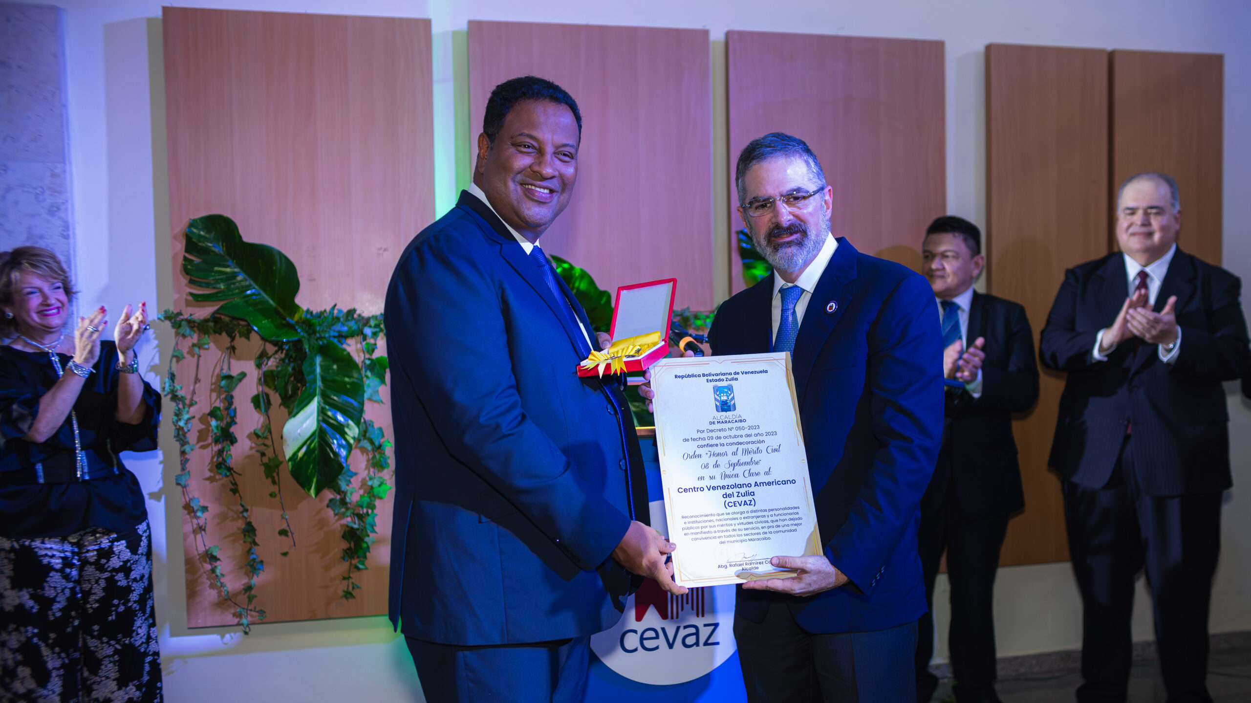 El alcalde Rafael Ramírez Colina y el presidente del Concejo Municipal, José Bermúdez, fueron los encargados de otorgarle las dos distinciones al CEVAZ. Ramón Álvarez, presidente de la Junta Directiva del CEVAZ, las recibió en nombre de la organización sin fines de lucro que promueve el intercambio cultural y educativo entre Venezuela y Estados Unidos, ofreciendo cursos de inglés, programas de becas, eventos culturales y servicios de biblioteca.