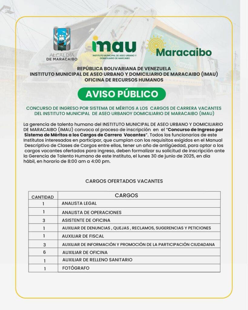 CONCURSO DE INGRESO POR SISTEMA DE MÉRITOS A LOS CARGOS DE CARRERA VACANTES DEL INSTITUTO MUNICIPAL DE ASEO URBANO Y DOMICILIARIO DE MARACAIBO (IMAU)