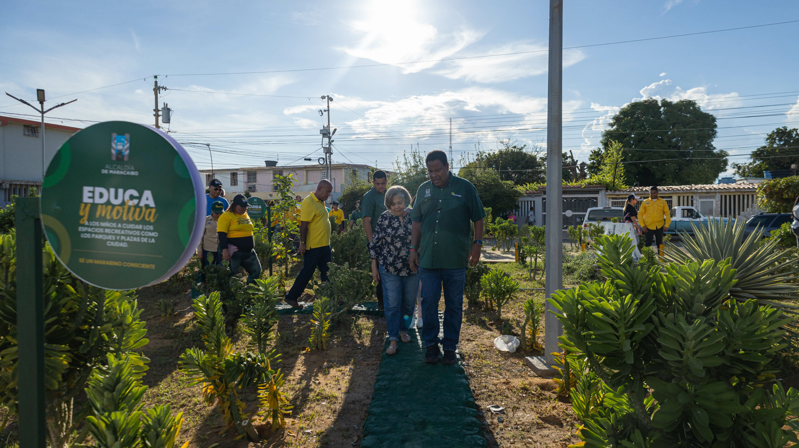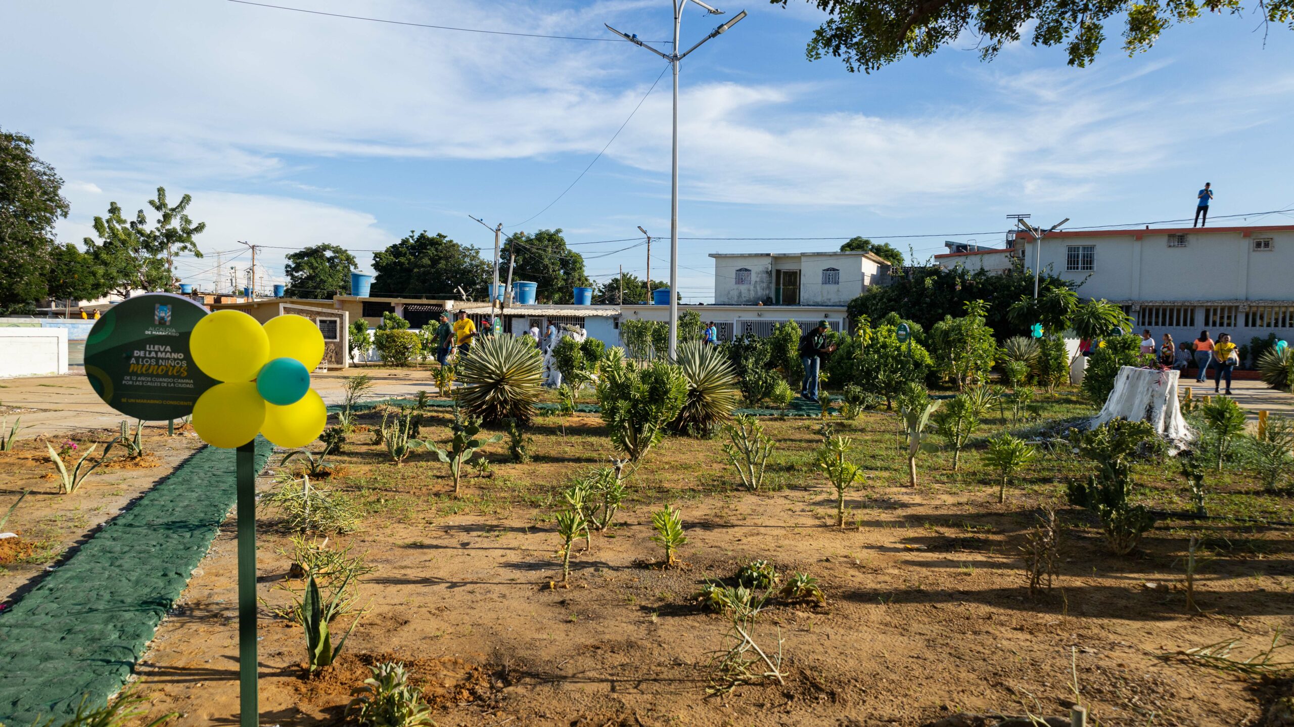 En la plaza Madrina Elia, del sector 3, se recuperó el paisajismo de sus áreas verdes, se realizaron caminerias, pintura de brocales, postes de iluminación, bancas, se colocaron más de cinco luminarias, mensajes del marabino consciente, la siembra de 66 plantas, entre ellas, cactus, trinitarias, caoba, sansevieria, entre otras, además se instaló la placa.