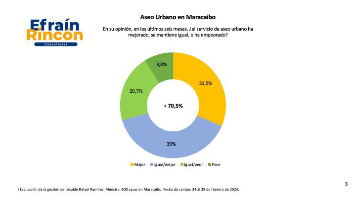 Con un 70,7 por ciento de calificación positiva cuenta el servicio de aseo urbano en Maracaibo, según una encuesta realizada por la reconocida firma Efraín Rincón Consultores. Los datos corresponden a un trabajo de campo realizado desde el mes de febrero con una muestra de 600 casos donde se evaluaron diferentes aspectos de interés de la población marabina.