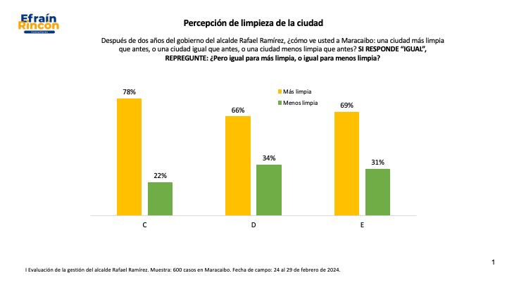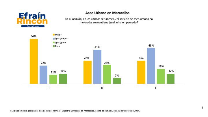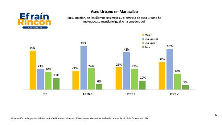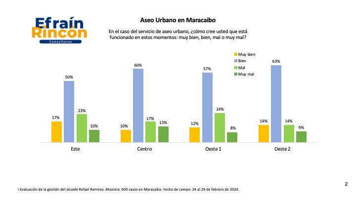 Al interrogar a los marabinos sobre su opinión del comportamiento del servicio de aseo urbano en los últimos seis meses, los datos reflejan una satisfacción, de más del 70 por ciento, con el servicio de recolección de desechos sólidos. Es decir, 7 de cada 10 marabinos valoran positivamente el servicio municipal de aseo urbano y ellos en su mayoría son del oeste de Maracaibo.