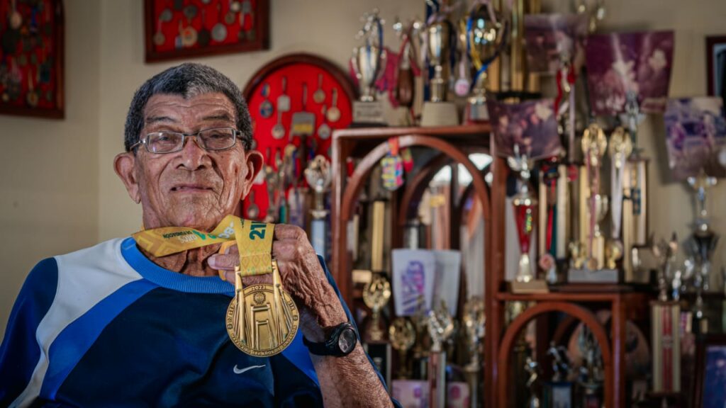 Con los brazos abiertos y con fuerte y amigable voz, dice: bienvenidos a mi ranchito. Una casa diseñada por sí mismo hace más de 50 años en el sector Haticos por arriba, donde colecciona sus incontables muestras de participación deportiva. Y es que, en 41 años corriendo, ha participado en 227 competencias, la primera en 1983.