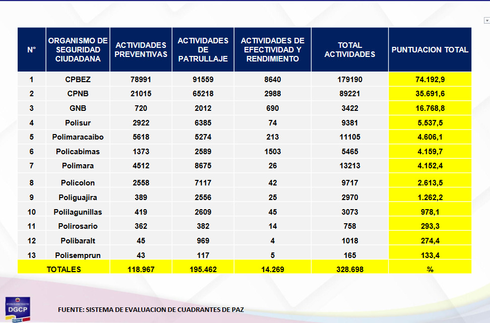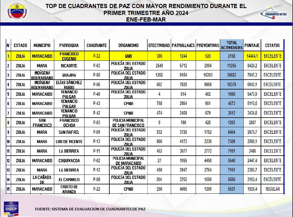 La evaluación que empezó a puntuar las acciones de las policías por cuadrantes desde octubre del 2023 y empezó a arrojar una escala de posicionamiento desde enero de 2024, ubica a Polimaracaibo en la posición N° 12 dentro de los 303 cuadrantes de Paz del Zulia. Esta es la primera vez que Polimaracaibo entra en el Top superando las operaciones de más de 250 cuadrantes de Paz el Zulia.