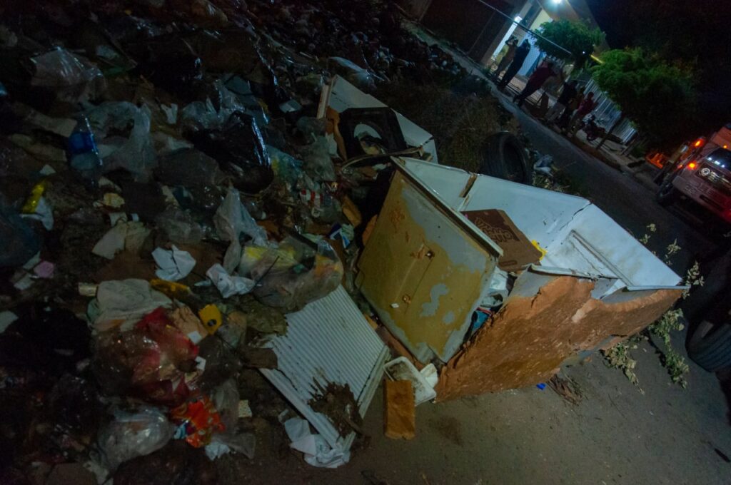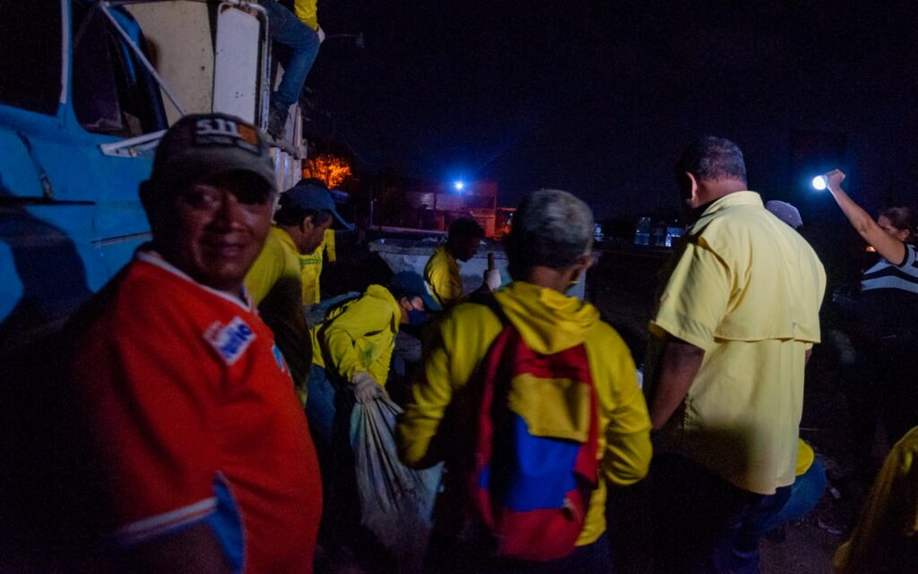 Ronald Mavárez, conductor de un camión volteo, explicó durante el recorrido nocturno: “A esta hora me toca colaborar en la recolección de la basura, luego debo ir al relleno con el cuidado de Dios de que no me pase nada en el camino, el trayecto es de una hora y media y luego regreso para seguir cargando”.